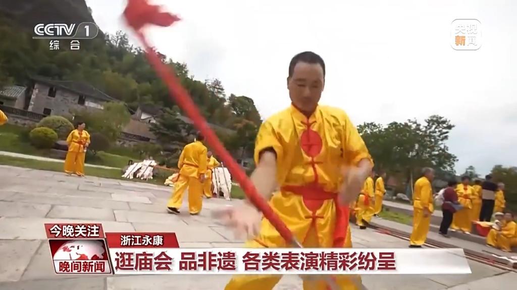 在浙江永康的方岩风景名胜区,热闹的方岩庙会吸引着八方游客。村民们身着传统服装,手举大旗,交叉跳阵,长棍独练、短棍对拆等武技表演精彩纷呈。打罗汉、旗袍秀、纸花制作等活动相继上演。