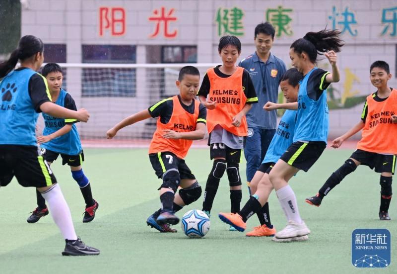 2024年5月25日,在陕西省西乡县第二中学,学生们在公益足球课上进行分组对抗。新华社记者 李一博 摄