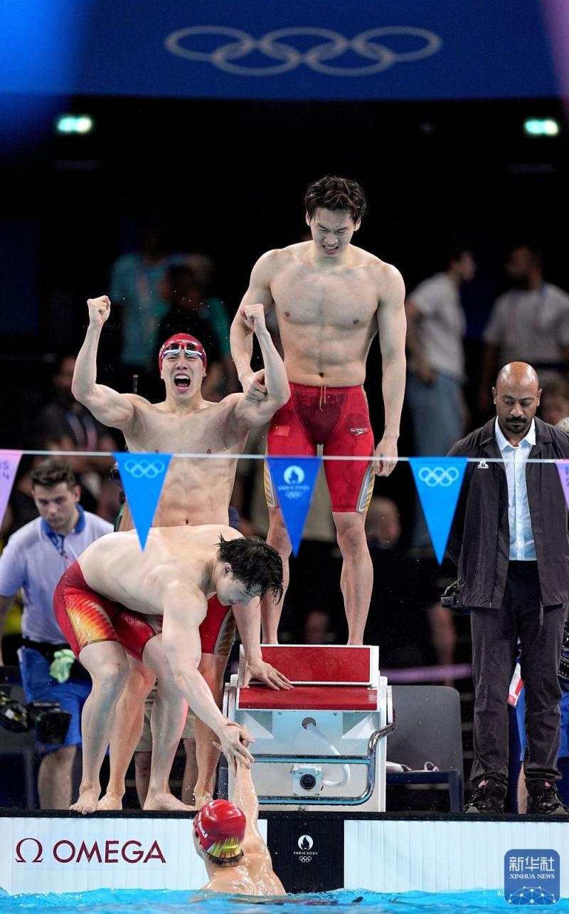 2024年8月4日,中国队选手在巴黎奥运会游泳项目男子4x100米混合泳接力决赛后庆祝夺冠。新华社记者 杜宇 摄