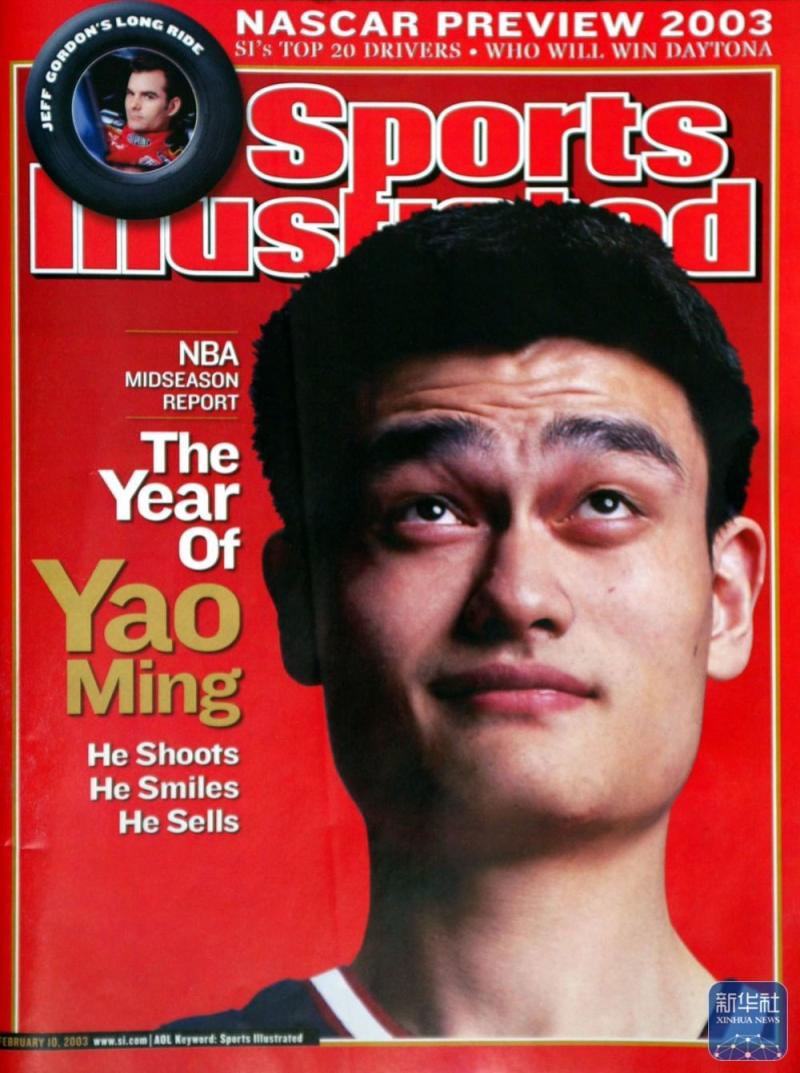2002年,姚明加盟NBA休斯敦火箭队,并逐渐成长为NBA顶尖中锋。这是2003年2月10日出版的美国杂志《体育画刊》,将姚明的头像刊登在封面上。这本著名的体育杂志把过去的一年称为姚明之年。新华社记者 吕明响 摄