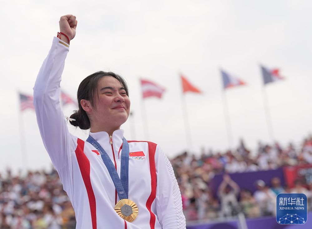 2024年7月31日,中国首位自由式小轮车奥运冠军邓雅文在巴黎奥运会自由式小轮车女子公园赛颁奖仪式上。新华社记者 李一博 摄