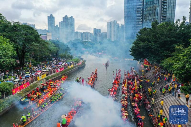 2024年6月10日,四里八乡的龙舟汇聚在广位于广州珠江新城的猎德涌参加龙船景(无人机照片)。新华社记者 刘大伟 摄