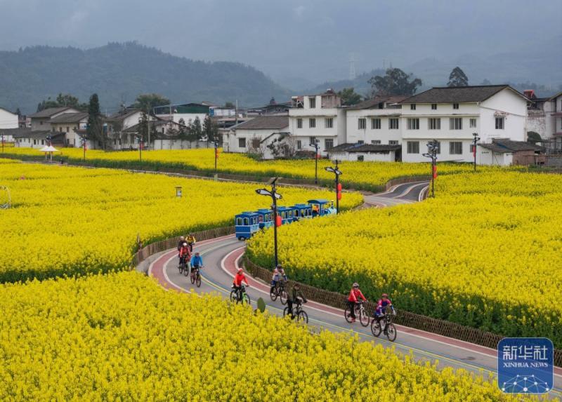 2024年3月7日,在四川省雅安市荥经县五宪镇粮经复合现代农业园区,几位骑友骑行在油菜花海间的绿道上。新华社记者 江宏景 摄