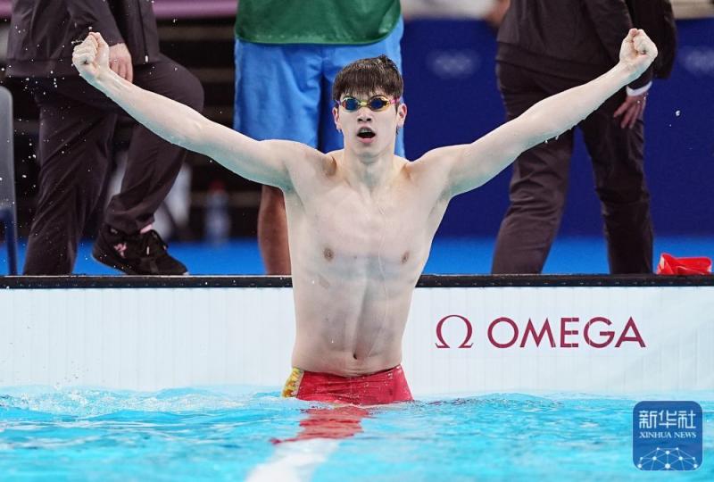 中国选手潘展乐在巴黎奥运会游泳男子100米自由泳决赛后庆祝夺冠及打破世界纪录(2024年7月31日摄)。新华社记者 杜宇 摄