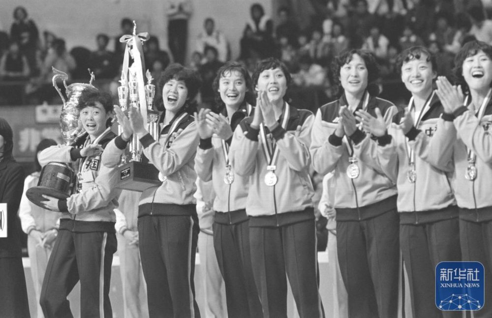 1981年11月,在日本举行的第三届世界杯女子排球赛上,中国女排以七战七捷的成绩,首次登上世界冠军领奖台。新华社发(黎启榕摄)