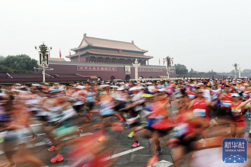 2023年10月29日,参赛选手奔跑在长安街上。当日,2023北京马拉松赛在北京天安门广场鸣枪开跑。新华社记者 鞠焕宗 摄