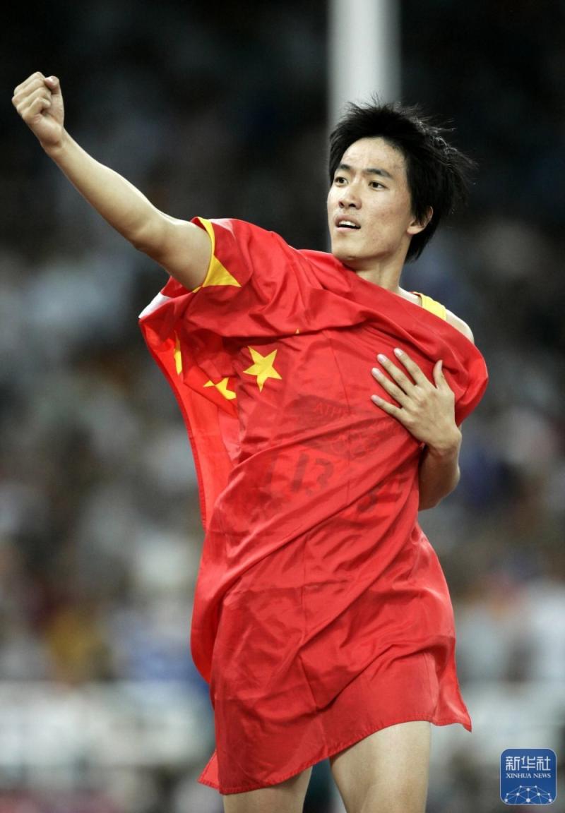 2004年8月27日,刘翔在雅典奥运会男子110米栏决赛中夺冠后身披五星红旗庆祝。他以12秒91的成绩夺取金牌,并平了世界纪录。新华社记者 廖宇杰 摄