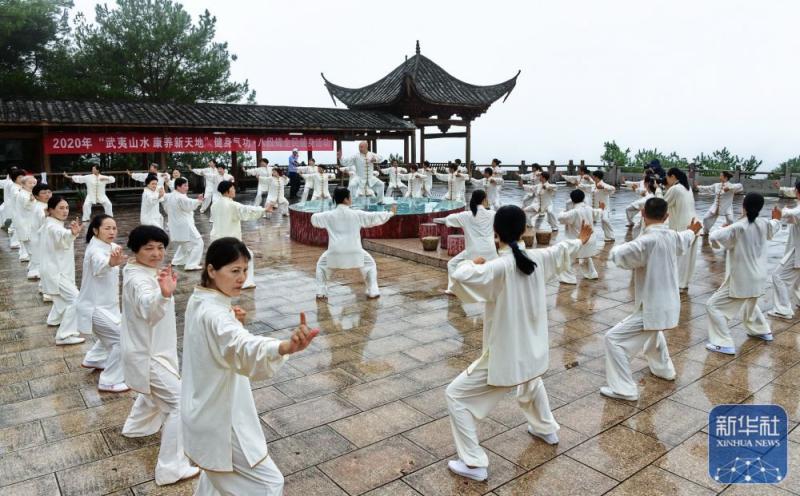 2020年9月16日,健身爱好者在武夷山齐云峰景区表演健身气功八段锦。新华社发(陈颖摄)