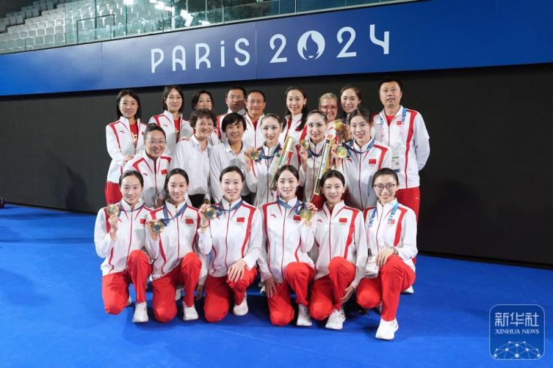 2024年8月10日,巴黎奥运会花样游泳冠军中国队成员在颁奖仪式后合影。中国花样游泳队首次奥运见金,就包揽集体和双人项目两金。新华社记者 薛宇舸 摄