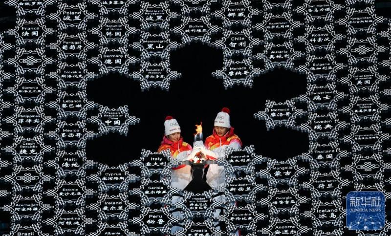 2022年2月4日晚,第二十四届冬季奥林匹克运动会开幕式在北京国家体育场举行。这是最后一棒火炬手迪妮格尔衣拉木江(左)和赵嘉文将火炬嵌入大雪花中央。新华社记者 李尕 摄