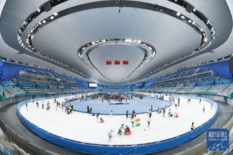2023年7月1日,人们在国家速滑馆冰丝带里滑冰。国家速滑馆是2022年北京冬奥会速度滑冰项目的比赛场馆。新华社记者 鞠焕宗 摄