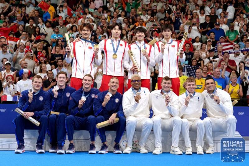 2024年8月4日,冠军中国队选手徐嘉余、覃海洋、孙佳俊、潘展乐(上,从左至右)与亚军美国队、季军法国队在巴黎奥运会游泳男子4x100米混合泳接力颁奖仪式上。中国队打破美国队对这一项目金牌长达40年的垄断。新华社记者 杜宇 摄
