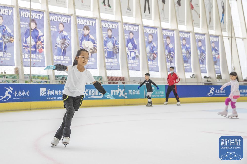 2022年8月8日,在重庆冰纷万象滑冰场,孩子们练习花样滑冰。新华社记者 黄伟 摄