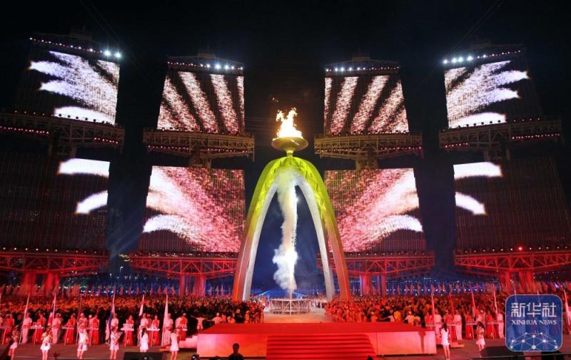 2010年11月12日,第16届亚洲运动会开幕式在广州海心沙岛举行。这是在开幕式上,主火炬熊熊燃烧。新华社记者 凡军 摄