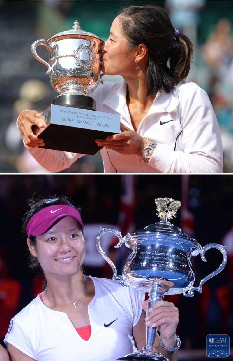 网球运动员李娜在2011年法国网球公开赛、2014年澳大利亚网球公开赛夺得女子单打冠军,成为两项网球大满贯赛事的首位亚洲女单冠军。上图为2011年6月4日,李娜在法网女单颁奖仪式上亲吻冠军奖杯。新华社记者高静摄;下图为2014年1月25日,李娜在澳大利亚网球公开赛女单颁奖仪式上手持冠军奖杯留影。新华社记者 李俊东 摄