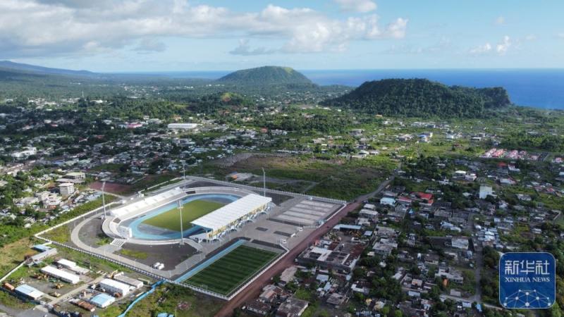 这是2021年4月8日在科摩罗的大科摩罗岛拍摄的中国援建的万人体育场(无人机照片)。新华社发(马浩宇摄)