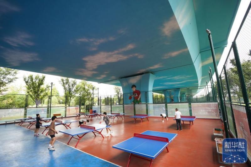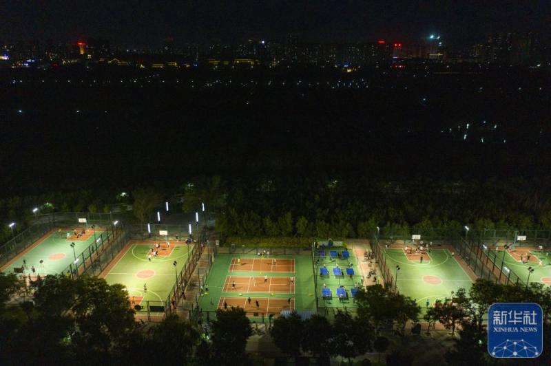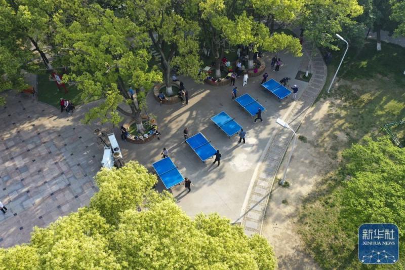 2023年5月14日,市民在江苏省淮安市金湖县翠湖园公园打乒乓球(无人机照片)。新华社发(梁德斌摄)