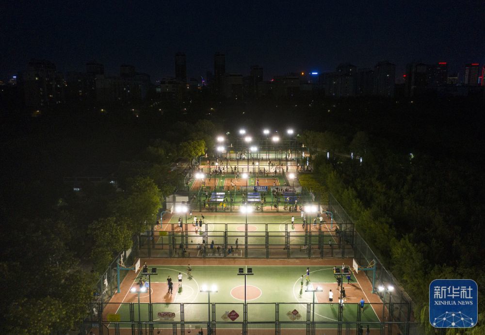 2020年7月29日,市民在宁夏银川市毓秀公园运动场内锻炼(无人机照片)。新华社记者 冯开华 摄