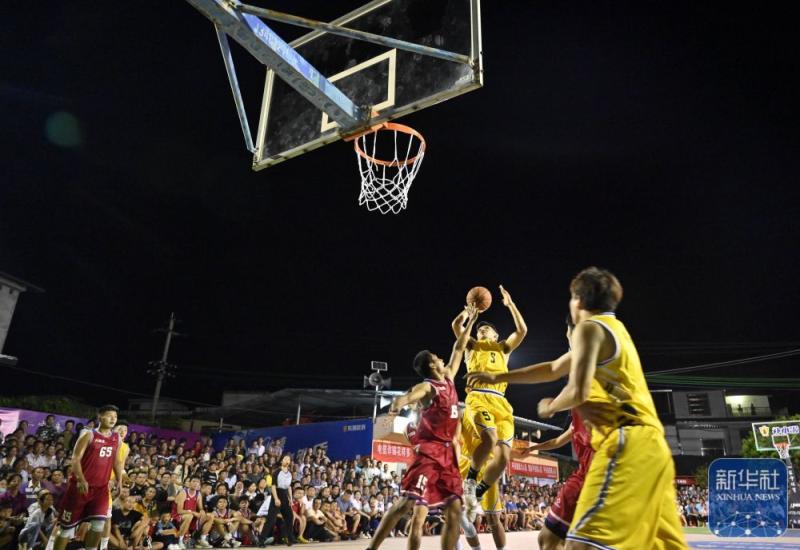 2023年9月6日晚,在广西柳州市柳江区穿山镇男子篮球赛决赛现场,球员在场上拼抢。新华社发(黎寒池摄)