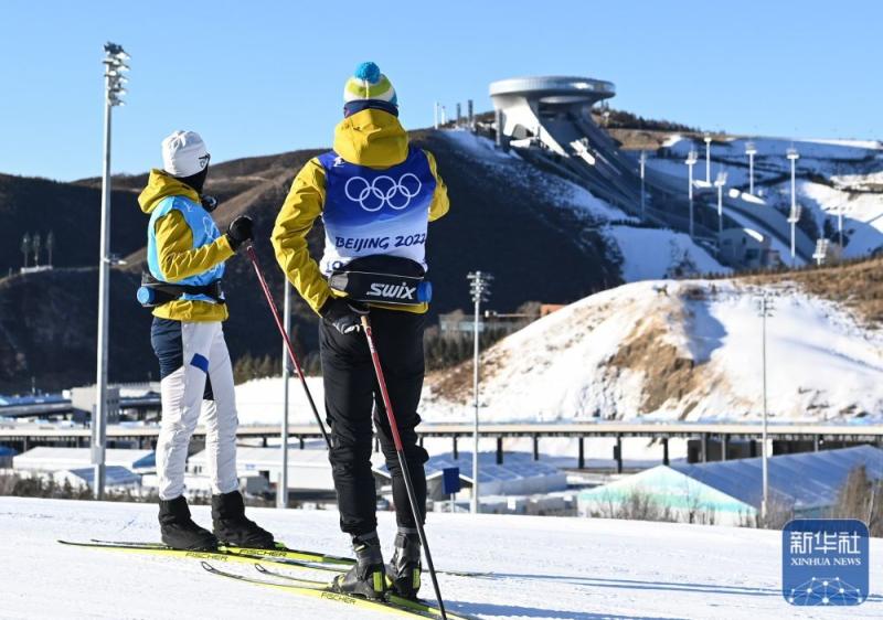 在国家越野滑雪中心,运动员在训练间隙休息(2022年1月27日摄)。 国家越野滑雪中心位于崇礼冬奥核心区古杨树场馆群的东南侧山谷。北京冬奥会期间,国家越野滑雪中心承担越野滑雪和北欧两项部分比赛。新华社记者 邓华 摄