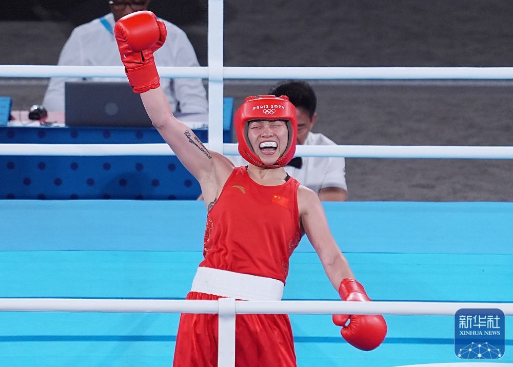 2024年8月8日,常园在巴黎奥运会拳击项目女子54公斤级决赛后庆祝夺冠。新华社记者 张帆 摄