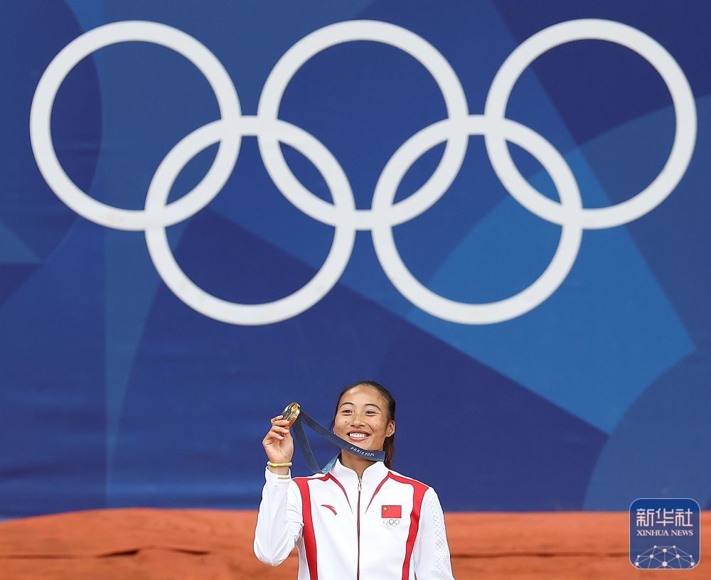 2024年8月3日,郑钦文在巴黎奥运会网球女子单打金牌赛中2比0战胜克罗地亚选手维基奇,获得中国队历史首枚奥运网球单打金牌。新华社记者 赖向东 摄