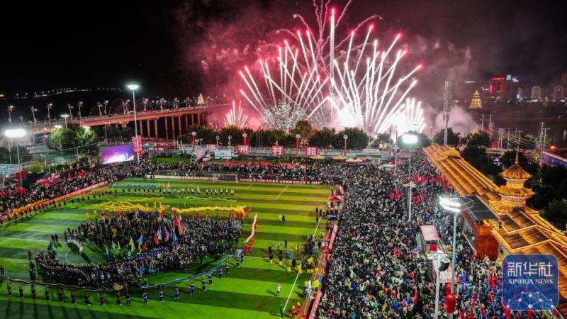 2024年2月3日,2024全国村晚示范展示活动暨贵州村超村晚举行音乐烟花秀表演(无人机照片)。新华社记者 刘续 摄