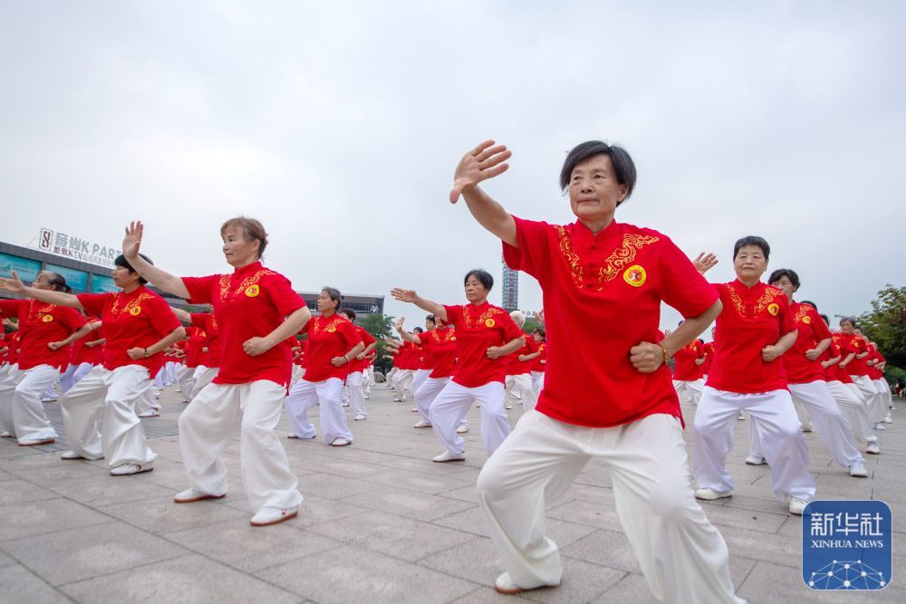 2023年8月8日,位于浙江省湖州市长兴县雉城街道的和文化广场,市民在练习太极拳。新华社发(谭云俸摄)