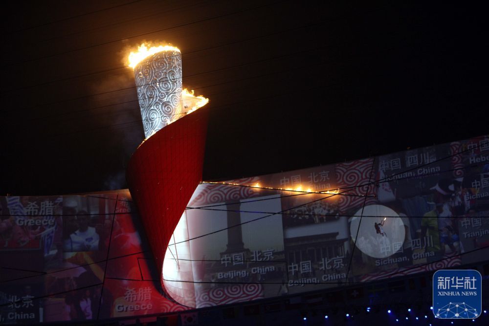 2008年8月8日,最后一棒火炬手李宁在北京奥运会开幕式上点燃主火炬。新华社记者 姚大伟 摄