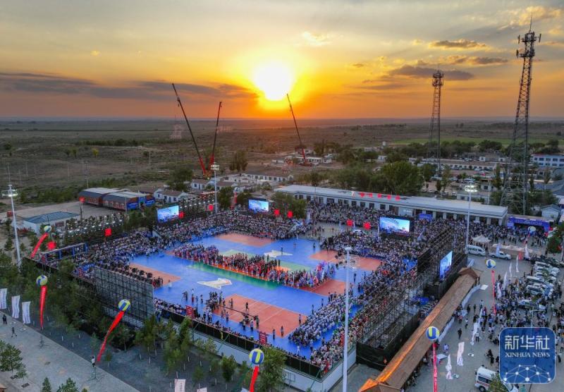 2024年7月18日,鄂尔多斯草原村排暨沿黄九省区农牧民排球邀请赛在内蒙古鄂尔多斯市鄂托克前旗昂素镇开幕(无人机照片)。新华社发(王正摄)
