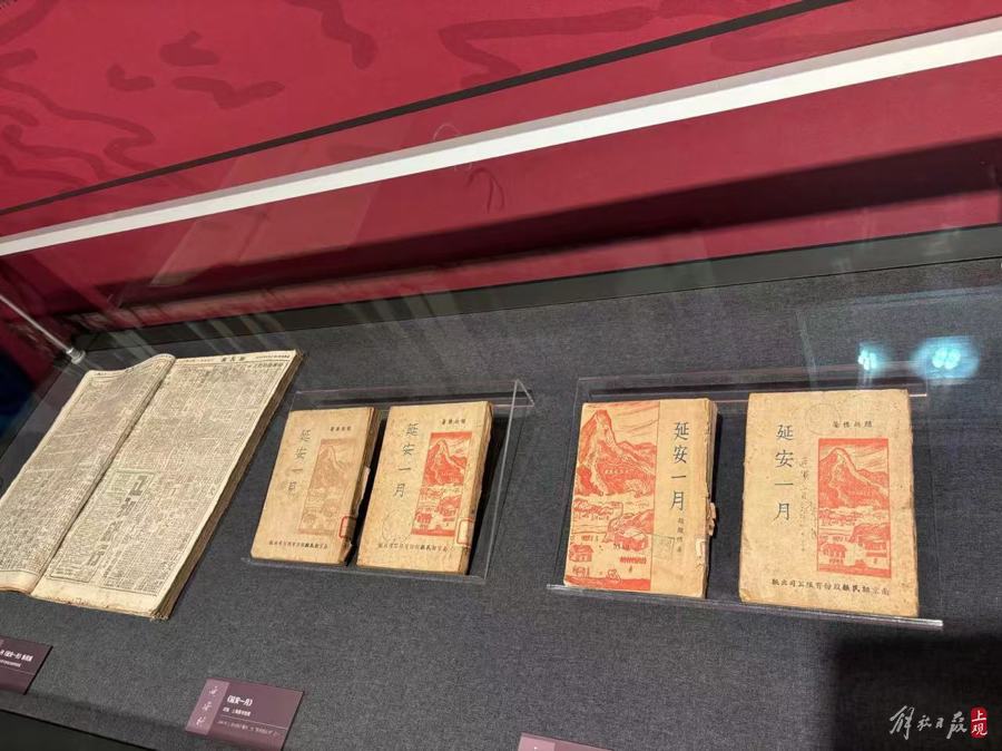 左起:1944年首发连载《延安一月》的重庆新民报,1944年1945年重庆初版、再版、成都印再版、重庆三版《延安一月》,均为首次公开展出。李天扬 摄