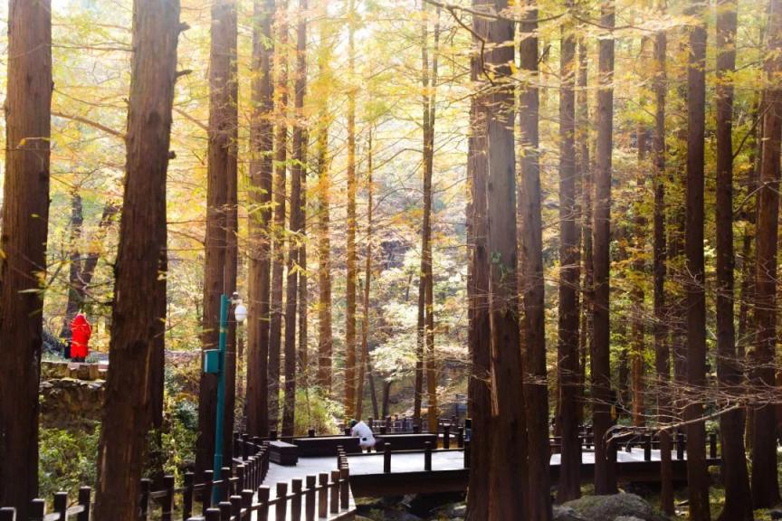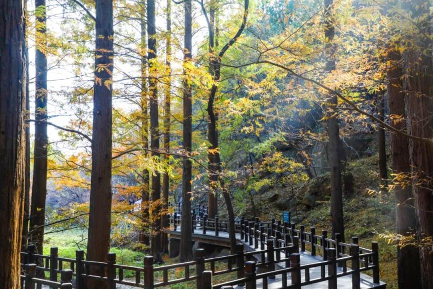 深秋之际,位于樱桃沟内的水杉林换上秋装,尽显古朴肃穆。水杉是世界上珍稀的孑遗植物,被誉为植物界的活化石,这里也是北方地区种植面积最大的水杉林。漫步于木质栈道之上,高大秀丽的树体蔽日遮天,仿佛将时光的流转娓娓道来,透露着历经世事的坚毅沧桑。