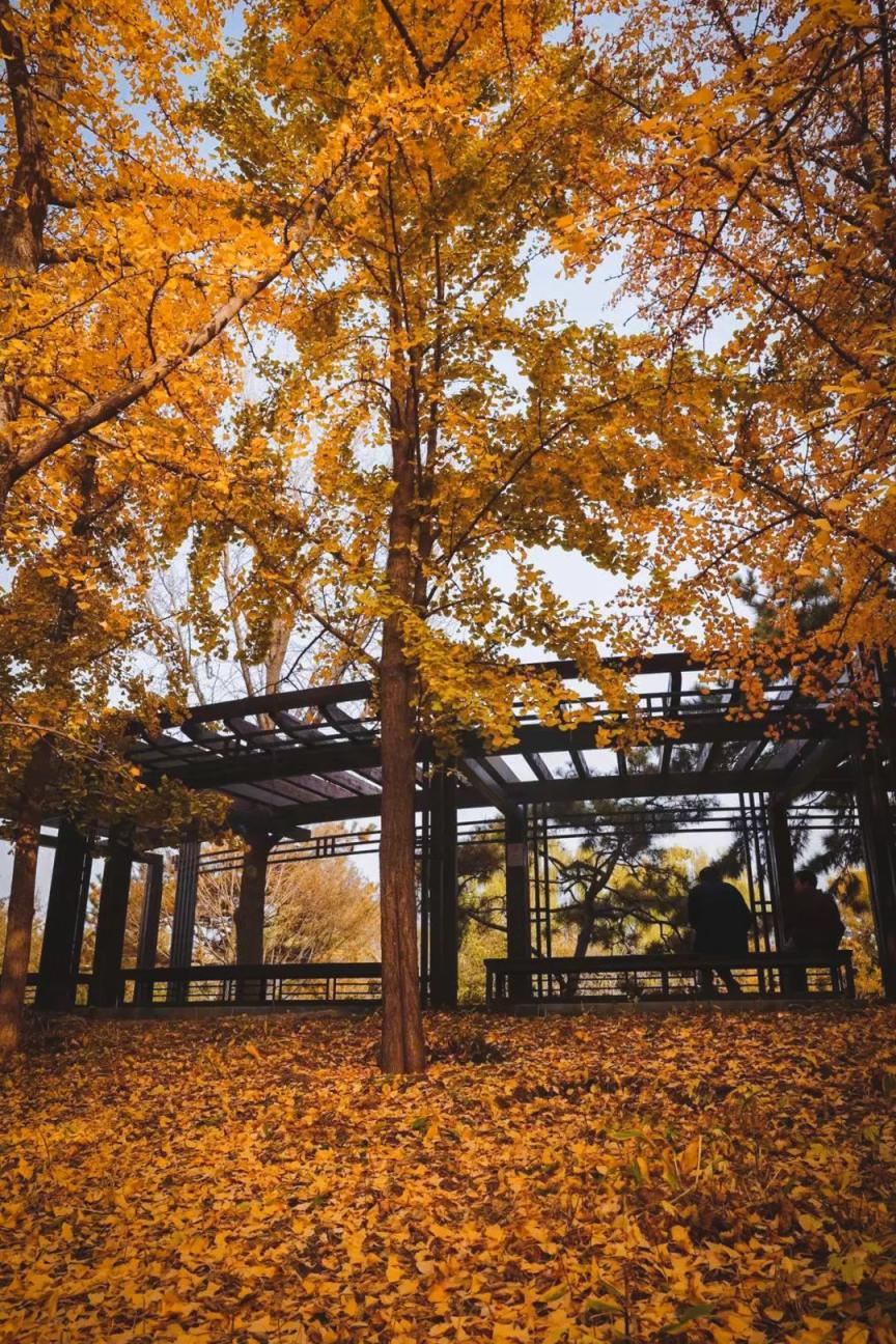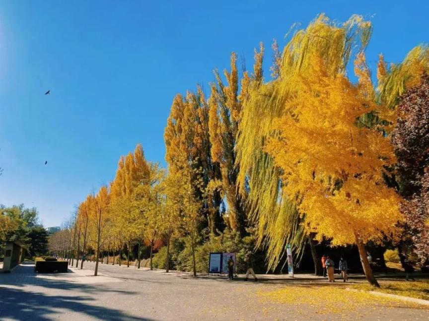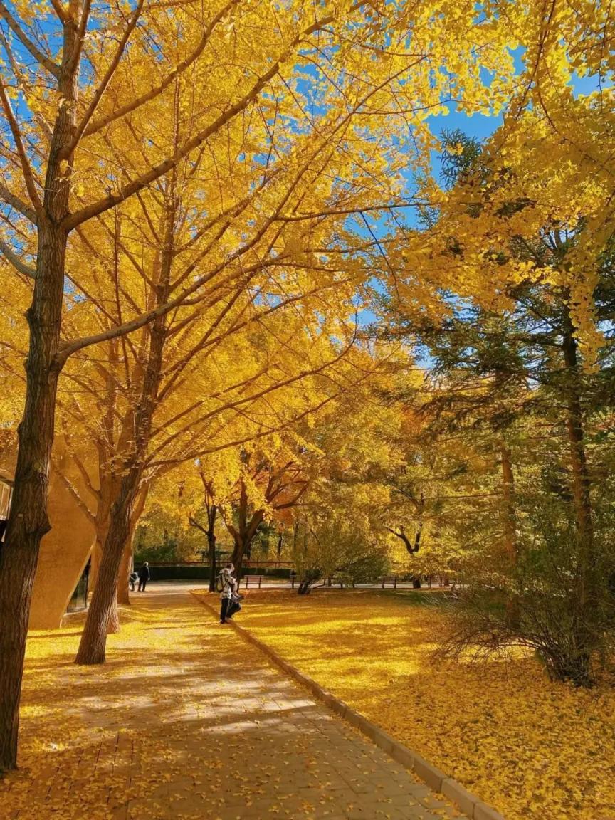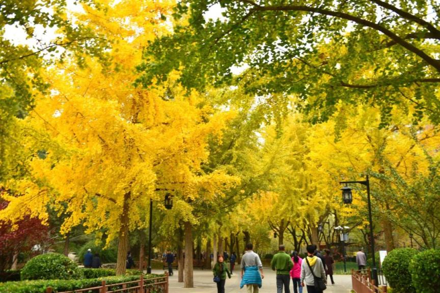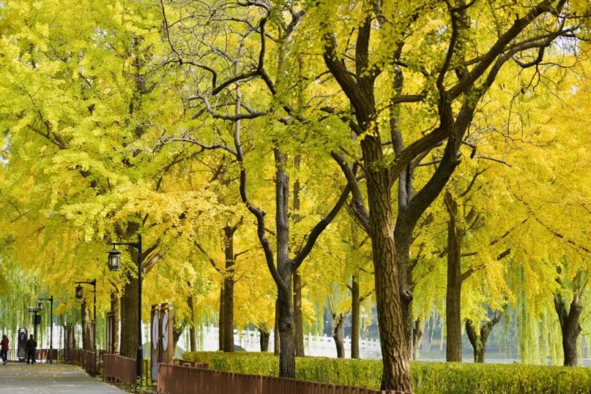 整齐的银杏林栽种在道路两侧,形成一道亮丽的秋季风景线,游客漫步在安逸舒适的步道中,体验着来自秋天坛特有的风景。