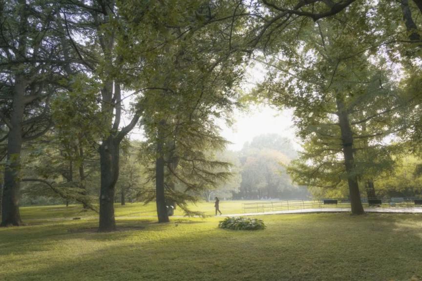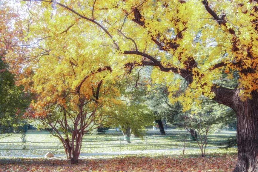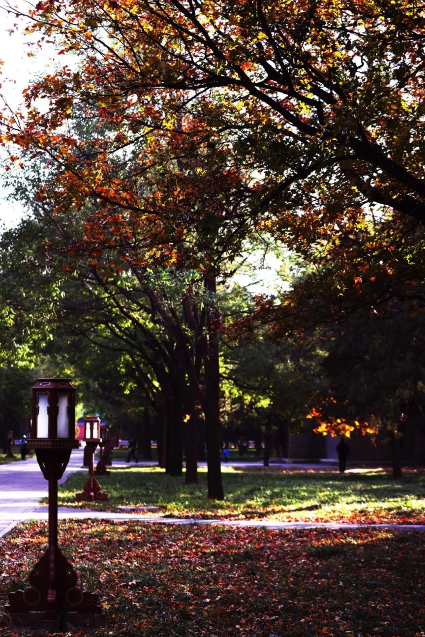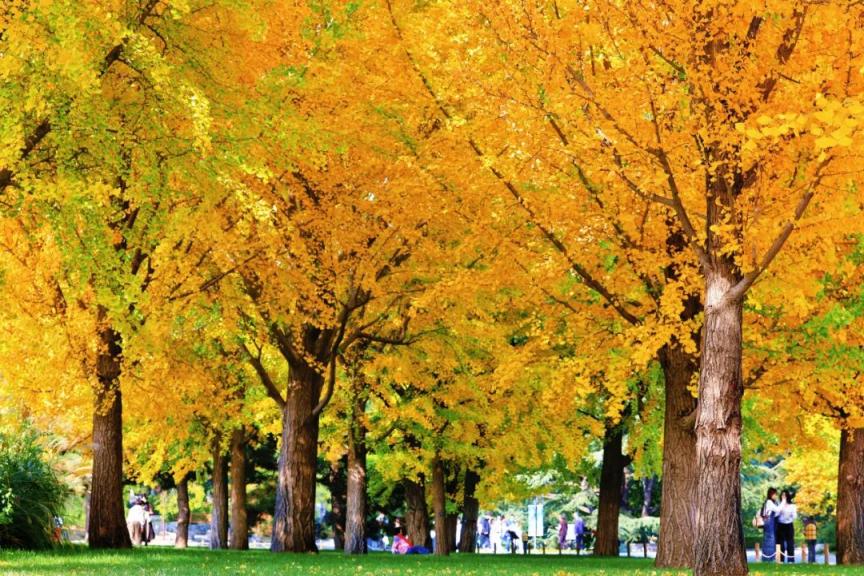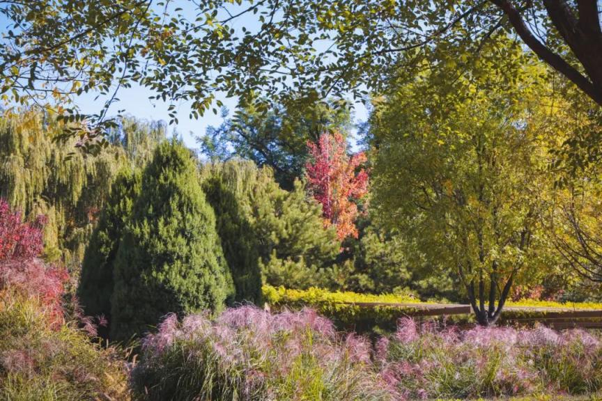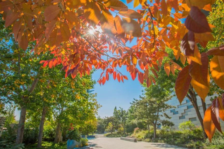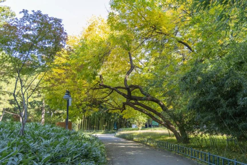 深秋时节,银杏、栾树、白蜡、悬铃木叶子渐黄,樱花叶片渐红,秋日的阳光透过棕色长廊,黄、红、棕的温暖色调以及周围的常绿植物将映衬出一幅色彩丰富的秋季画册。