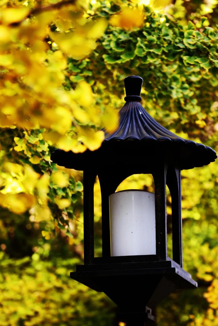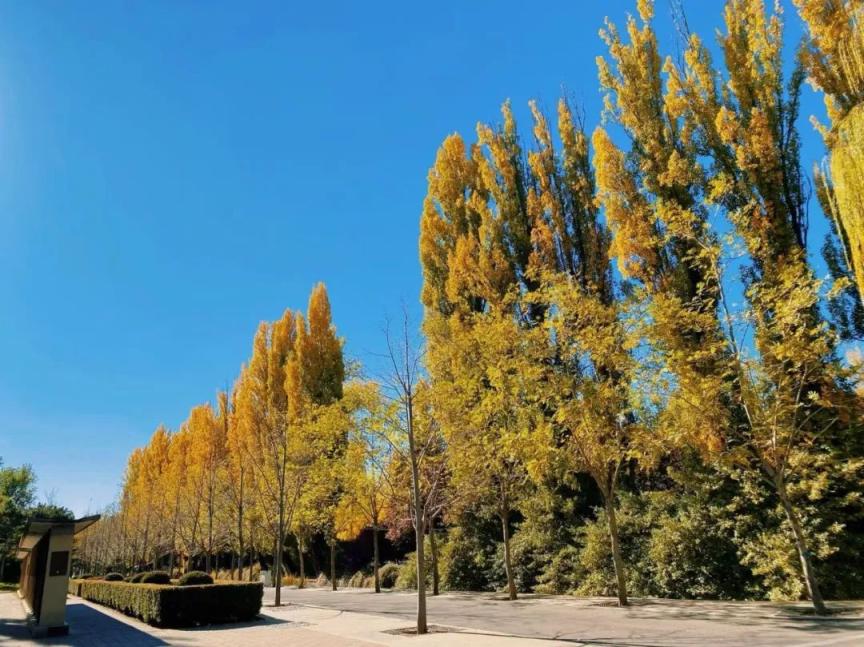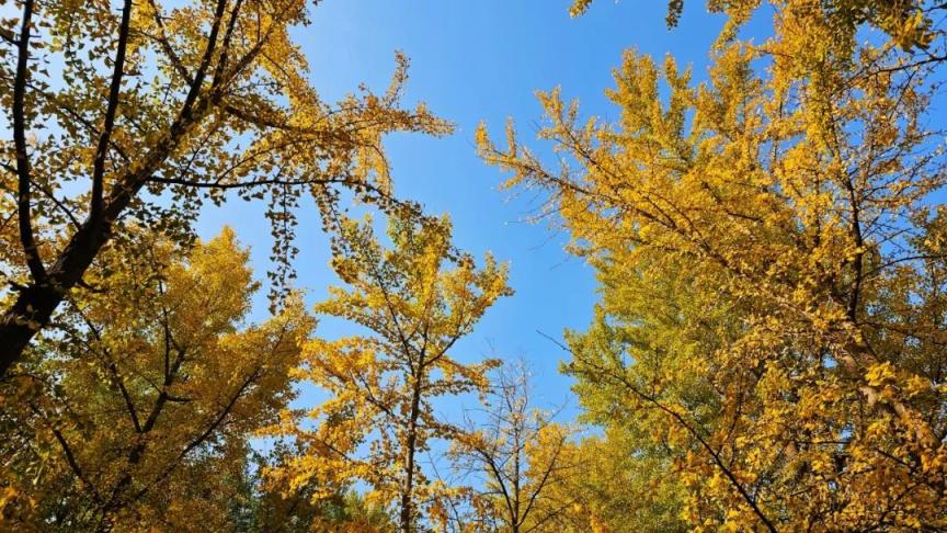 一棵棵银杏树对称地分布在公园主干道两侧,长达200余米。秋风轻抚,片片金叶闪烁其中,犹如点点繁星,在暖阳下熠熠生辉,引人驻足。