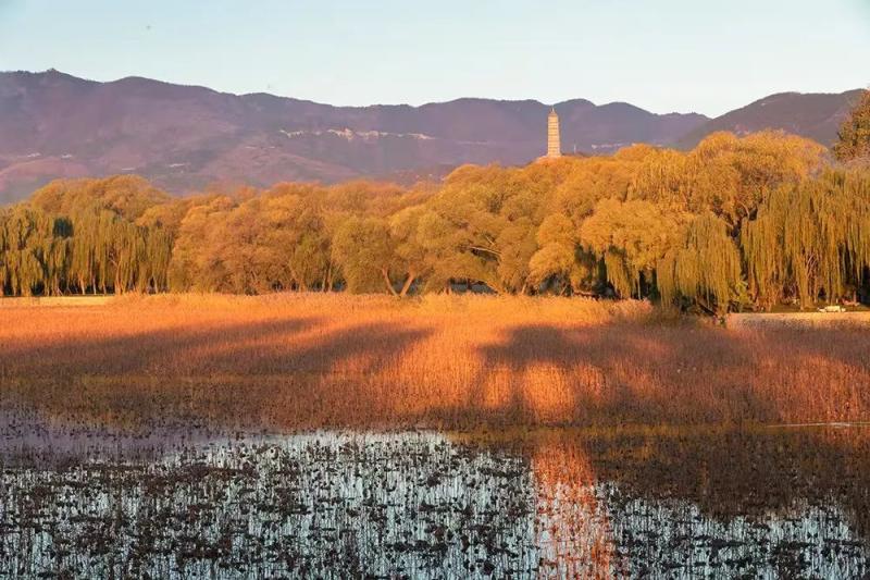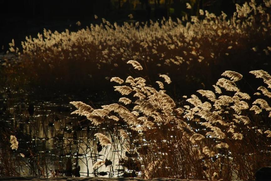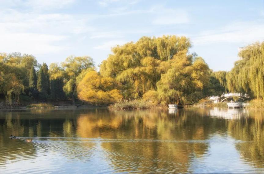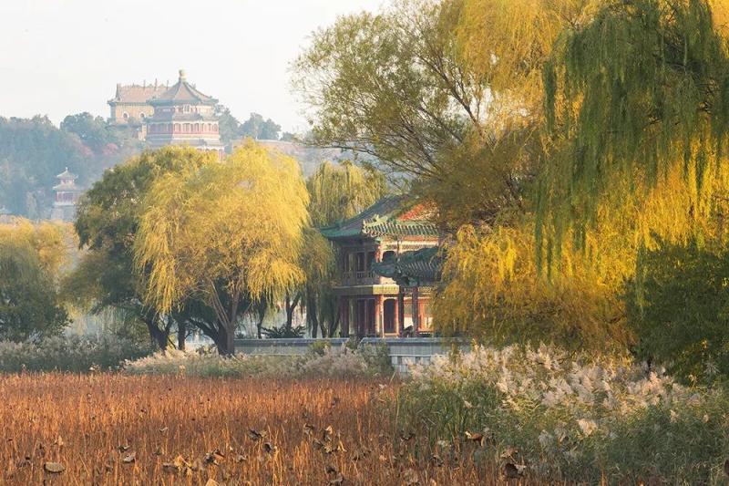 从西门入园,柳树和芦苇叶子逐渐转黄,为园林增添了一份宁静而深远的美。