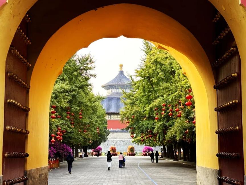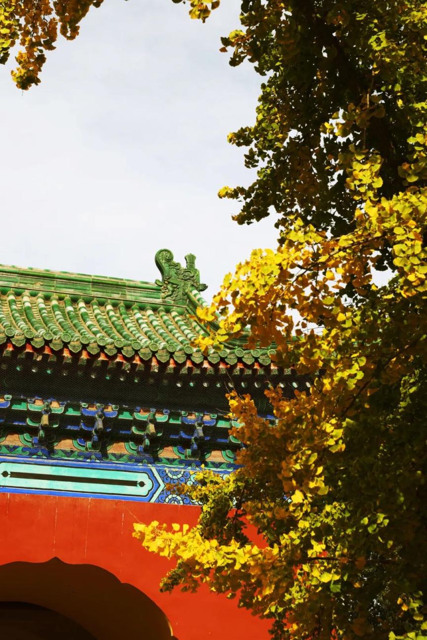 金秋时节,树冠浓密的银杏树排排而立,红墙的庄重与银杏的金黄形成了鲜明的对比,为秋日园林增添了别样的魅力。透过棂星门,社稷坛显得深远而神秘。