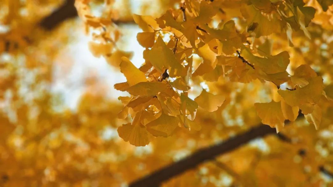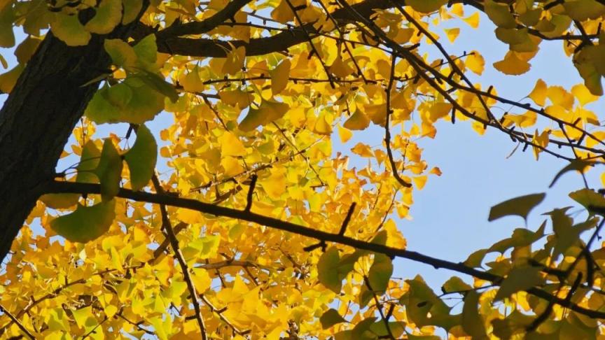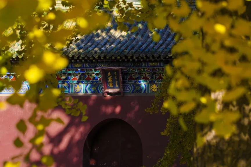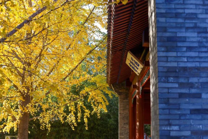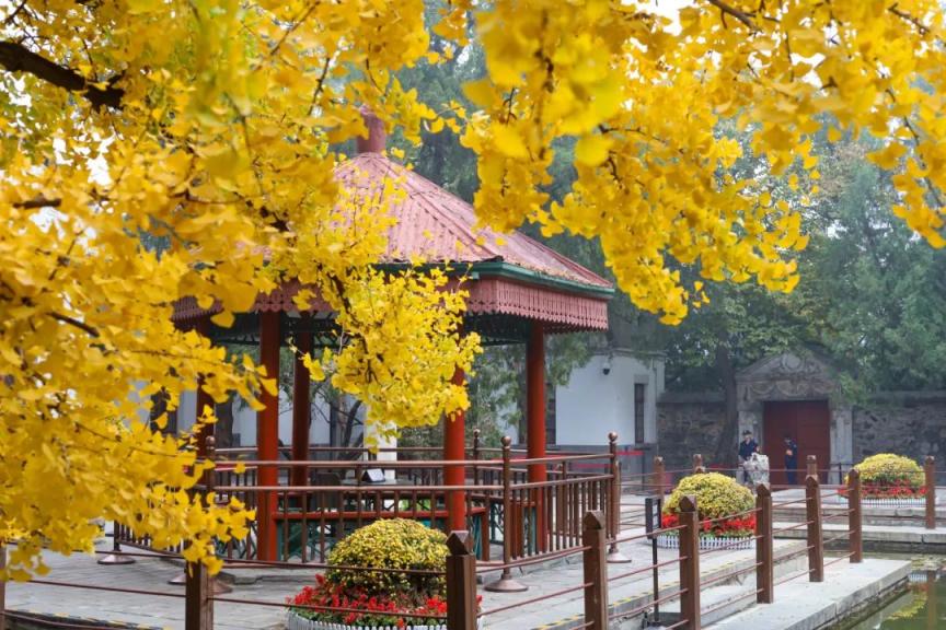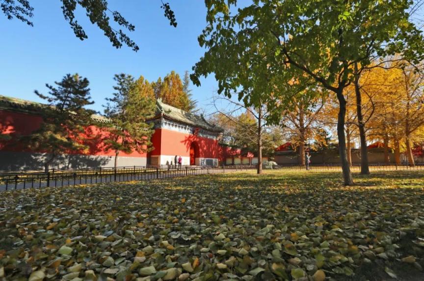 银杏树形高大,挺拔壮观,叶片形状如折扇,入秋叶子逐渐由绿色变为黄色,目前正呈现出漂亮的渐变颜色。金色的银杏叶与红墙古迹相得益彰,颇有古韵秋色。