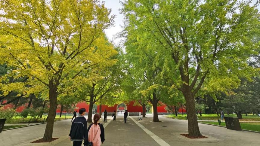 来到北天门欣赏金色的银杏,由北向南的一条百米的金色大道,金黄色的银杏与祈年殿北面相衬出古建和天坛生态之美。