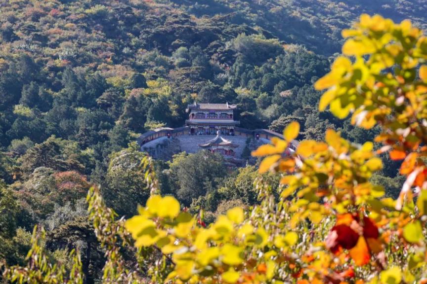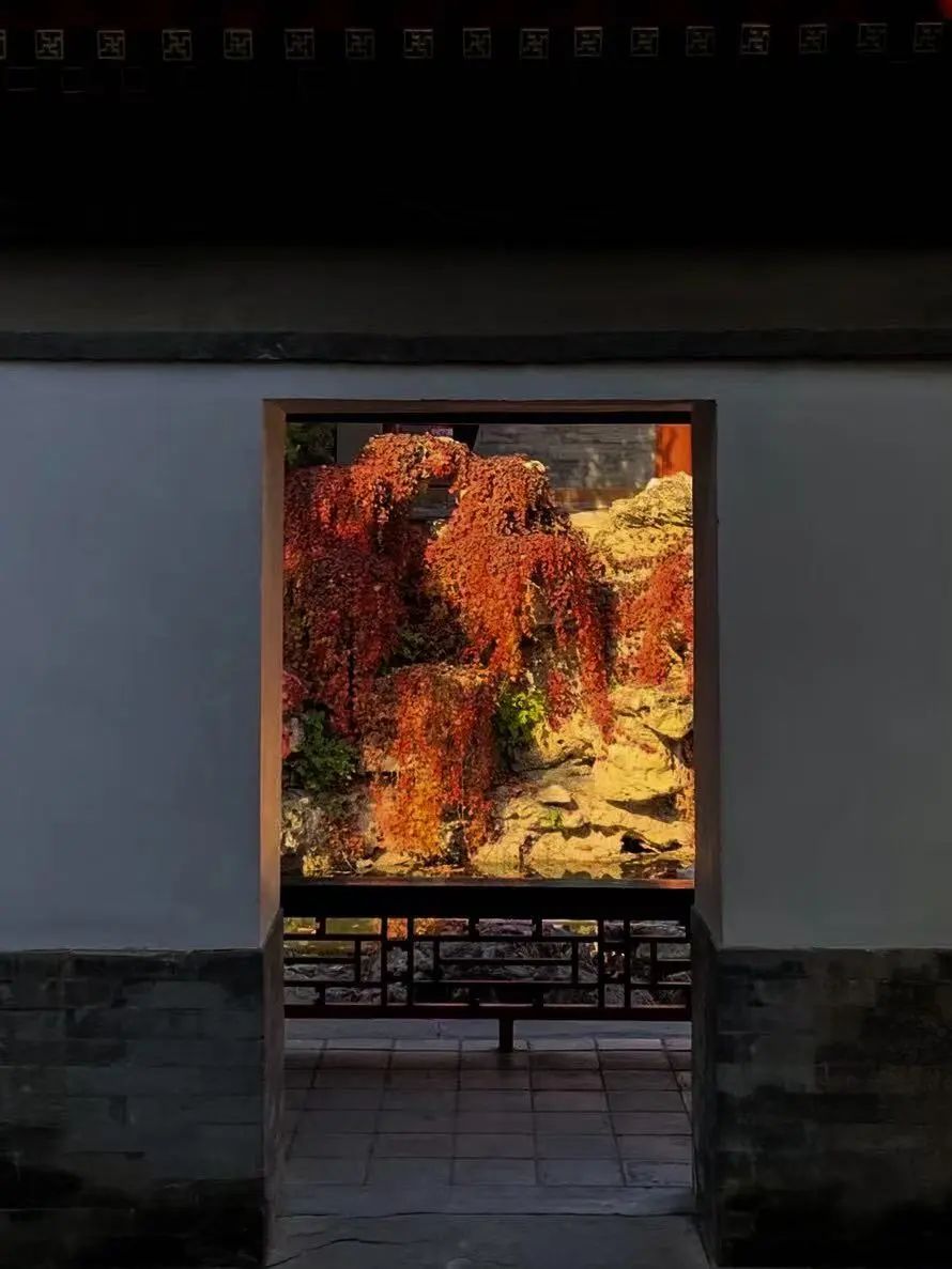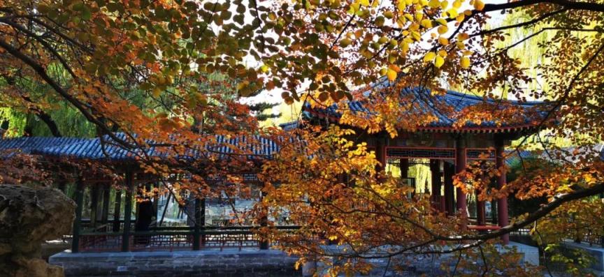 静心斋内目前植被的色彩是最为丰富的,红色的枫叶、地锦,绿色的苍松翠柏,黄色的杏树,藤蔓,由远到近错落有致,如诗如画。