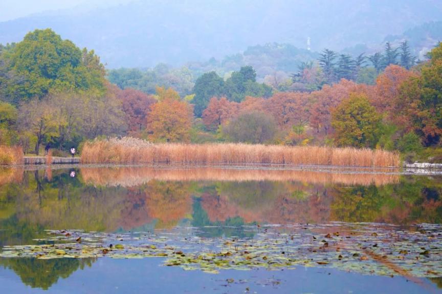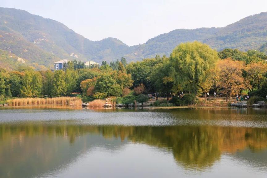 北湖周边是赏秋的理想场所,每逢秋季这里的元宝槭、金枝槐、大花卫矛、芦苇等草木都将换上秋装,勾勒出色彩丰富的景观带,与远处层峦起伏的山峰一同倒映在湖水之中,斑斓绚丽,绘就一幅优美的秋日画卷。在北湖南侧还可以欣赏到三花槭、血皮槭等少见的特色彩叶树种。