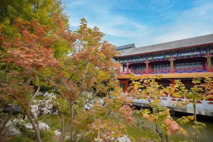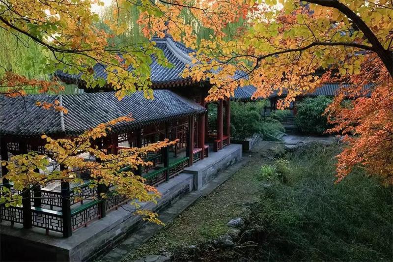 谐趣园涵远堂东侧、西侧土石结合的假山上自然生长着数十株北京乡土树种大果榆,秋色叶由橙色红色棕红色逐渐变化,与古建搭配,拍摄效果非常上镜。