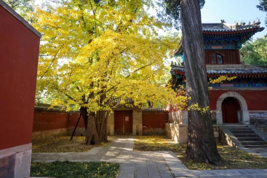 红墙为布、地锦为台,古老的寺庙景区,游客较少,格外古朴和清幽。高大、金黄的银杏,衬着建筑的一隅和屋脊的角兽,在岁月静好中尽显碧色净如云的美景。