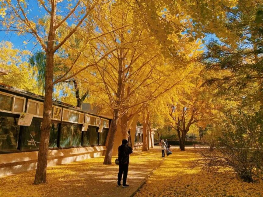 曹雪芹纪念馆又称黄叶村,顾名思义每到秋季这里栽植的数十株银杏进入变色期,步入其间就如同进入了金黄色的秋日画卷。与此同时,在展览温室周边,数株银杏植于茵茵绿草之上,亮丽色彩的碰撞展现不同韵味,尽显金秋魅力。