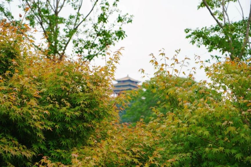 鸡爪槭的树姿优雅,树皮平滑,枝条轻盈,秋季叶色变化丰富浓郁,在阳光的照射下尤为迷人。站在科普园内,目光穿过层层叠叠的红叶向南望去,最终落在万春亭上,感受秋日里的古韵,令人心旷神怡。