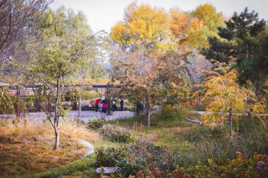 景区内,元宝枫、银红槭、茶条槭形成红黄绿交织的多彩画面。红红的海棠果挂满枝头,花叶芒、细叶芒等观赏草的花序随风摇曳,大量的月季花和一二年生花卉组成流畅的花带,漫步其中,宛如画中。