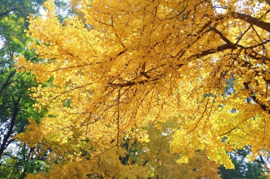 数十株高大银杏组成银杏林,秋季叶色金黄、落叶缤纷。