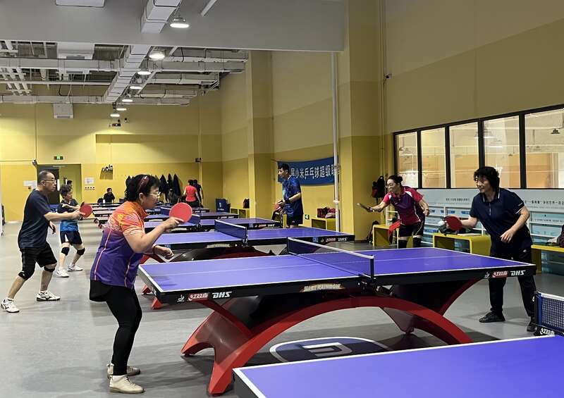 高兴如(前排左一)在回龙观体育文化公园的乒乓球馆内打球。中青报中青网记者 张艺/摄