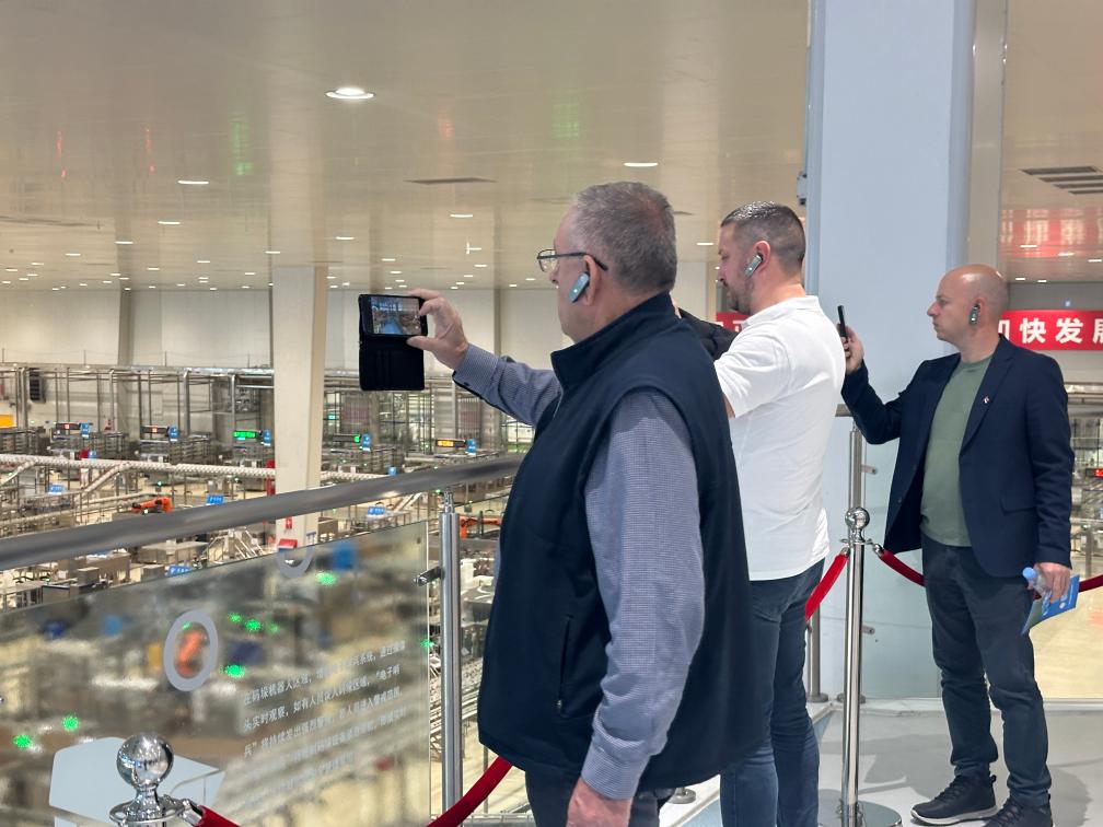 10月15日,来自塞尔维亚的外宾参观位于内蒙古呼和浩特的牛奶生产线。新华社记者 王雪冰 摄