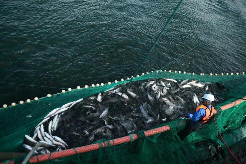 在捕捞的时候,使用自动吸鱼泵,让鱼像坐电梯一样轻柔地进入作业平台。因为传统吊网捕捞会让虹鳟鱼因紧张挣扎体内产生更多肌酸,这种物质会让虹鳟鱼的口感大打折扣。